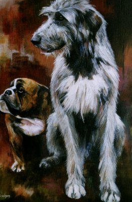 Ierse Wolfshond en ‘t bulletje, olieverf op linnen, 50 x 70 cm.