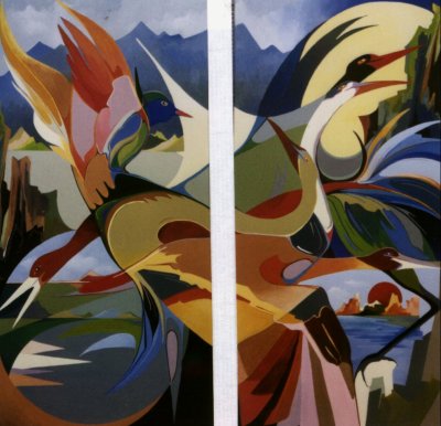 Tussen twee Werelden, tweeluik, acryl op linnen, tweemaal 60 x 120 cm.